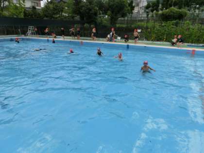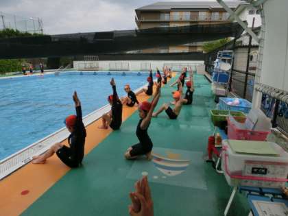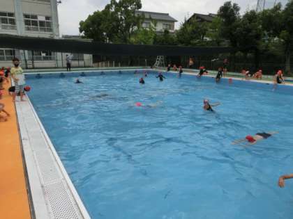 降水確率が高かったので,水泳はだめかな,と思っていたのですが,雨が降らず水泳をすることができました。水慣れが終わったら,けのびからのバタ足。そして,クロールの練習に入りました。ある子は,ヘルパーをつけて取り組み,ある子は,ビート版をもって頑張りました。顔を水につけるのが苦手な子は,碁石拾いの場に行って練習です。一人ひとり目当てを立てて取り組みました。最後には,検定をしました。けのびだけで,5m以上泳げる子がいました。けのびとバタ足で10m以上。クロールで50mも泳る子がいました。みんなとっても頑張って練習しました。