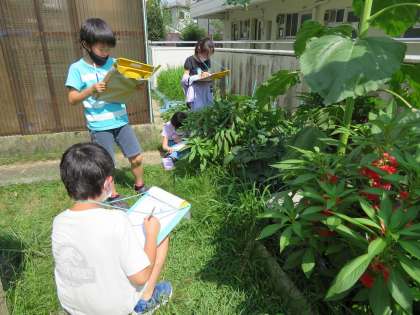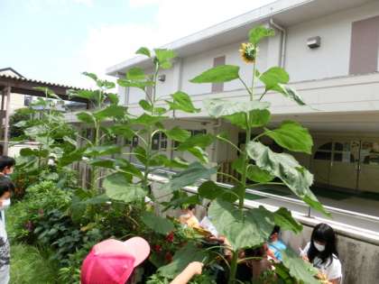 四月に蒔いた花の種。花が咲きました。ヒマワリは2mぐらいの背丈に。ホウセンカは白,ピンク・紫・赤と,きれいな花が咲きました。オクラと大豆は収穫できる大きさです。ゆでるとおいしい枝豆になりそうです。雑草を取り,水やりを欠かさずやったおかげかな。ヒマワリは,見上げないと花を見ることができません。秋には,何個の種がとれるかな。