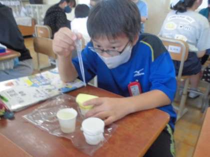 家庭科の学習でどの素材が水を吸収しやすいのかを調べました。
