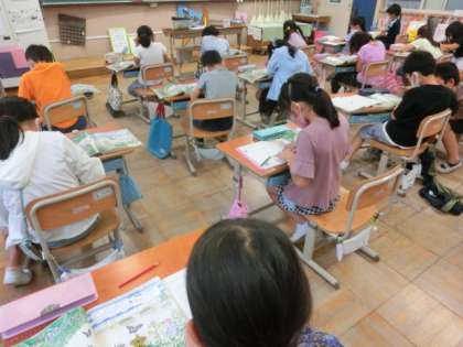 理科の学習で「動物のすみか」の単元に入りました。本当なら,予想を立てて校庭に出て動物を探しに行くつもりでした。しかし,雨が降っていたので教科書に,生き物を見つけた場所に生き物シールを貼りました。そして,どうしてそこに,その生き物がいるのかを考えました。「そこは食べ物があるから。」とか「そこにいると見つかりにくいから。」など,考えを発表してくれました。来週,実際に観察に行きます。