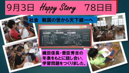 社会科では,織田信長と豊臣秀吉の年表から2人の武将は何を目指し,何をしたのかを話し合い,学習問題を作りました。