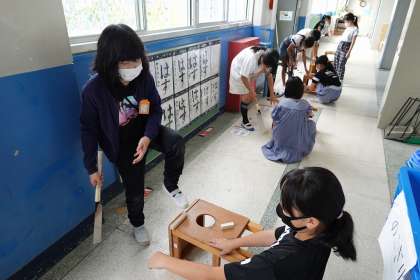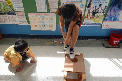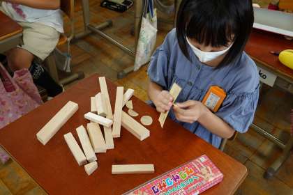 図画工作では「ギコギコ トントン クリエーター」の学習に取り組んでいます。のこぎりを使って木材をいろいろな長さに切り,切ったものを組み合わせて何がつくれるか考えました。