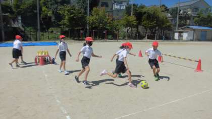 今日はチーム対抗の試合も行いました。どちらにゴールをすればよいか確認をして,ボールを自分からとりに行くこと,相手のいないところに蹴ることなどを意識して行いました。