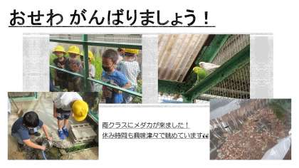 1年生の保護者の方がお家で飼っているメダカをプレゼントしてくださいました。生活科の『いきものとなかよし』の単元を見て,学校でお世話する生き物にぜひ・・ということで合計20匹程のメダカが仲間入り♪みんな休み時間にはメダカの様子に食いついていました。2組にいるメスのメダカに卵があることやメダカの体の色が違うことなど,子どもたちの観察力がすごい・・・!また明日からモルモット・インコ・さかな・虫のお世話もはじまります。いきものが心地よいなと思うお部屋を作ったり,餌をあげたりしてお世話を頑張ってください。