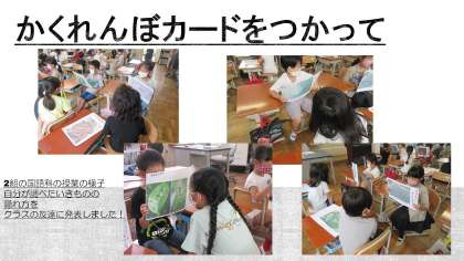 そして2組では「かくれんぼカード」を用いて自分の調べた生き物を友だちと交流しました。友だちの発表を聞いてよかったところや,自分の調べた生き物と似ているところなど,振りかえりもしっかりできていました◎1組は金曜日に友だちとの交流を行います。たのしみにしておいてください。