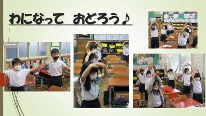 今日は朝からあいにくの雨降り。「運動場で走りたかった〜」という声が聞えてきました。今日の体育は「わになっておどろう」のダンス練習とボール遊びを行いました。中間休みや昼休みにも「ダンスの動画見せてください!」と練習に意気込む子どもが多く,気づかぬうちに完璧に踊ることができる子どももいました。