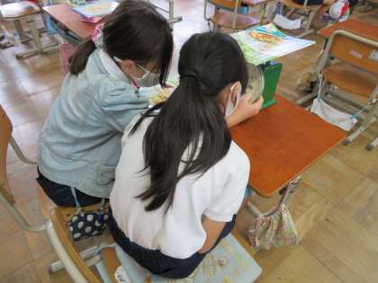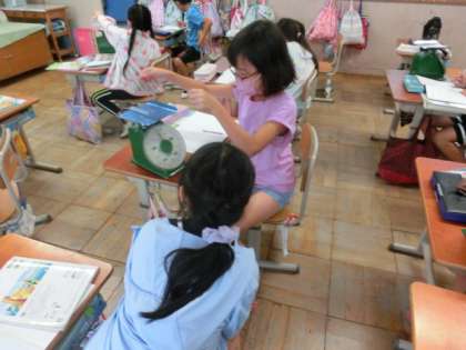 1目盛りが何グラムか考えた後,実際にはかりを使いました。はかりを使う時は,平らな場所に置くこと,まっすぐ前からめもりを読むことを意識して,算数の教科書を量ってみました。「270グラムくらいやな!」としっかり読むことができていました!そのあとは,はさみ,のり,体操服など身の回りのいろいろなものを量りました。