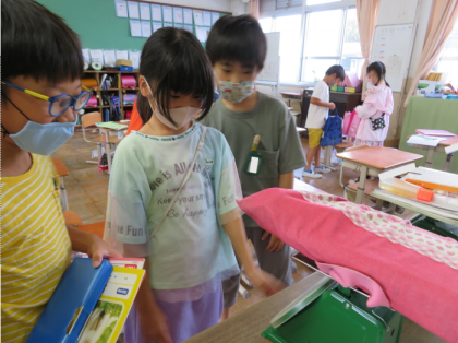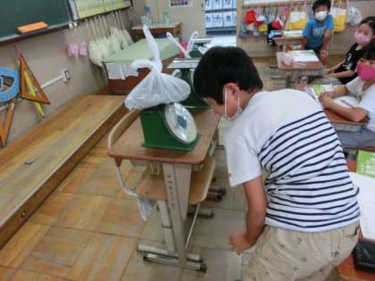 まず先生たちが用意した3つの袋を持って1つだけある1キログラムのものを当てるクイズをしました。「これは重い気がする…。」,「AとBの違いがわからない。」と悩んでいました。1キログラムがどのくらいか分かった後には自分の身の回りのものを組み合わせて予想してつくりました。先生たちのところにある量りに載せられるのは2回まで!みんな1キログラムの袋を持ち上げては「違うわ。重いな。」,「ぴったりな気がする。」と調整して,とても盛り上がりました。