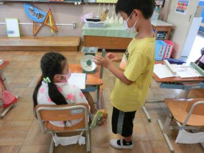 自分が量りたいものはどれぐらいの重さか予想して,1キログラムのはかり,2キログラムのはかり,ばねばかりから量るのにふさわしいと思うものを選びます。ばねばかりは200グラムしか量れないので,「はさみ」や「三角定規」など軽そうなものを選んで量っていました。「これは少し重そうやし,2キログラムのはかりがいいかな。」,「これは1キログラムもないと思うな。」とみんな予想を立てて,たくさん考えていました。