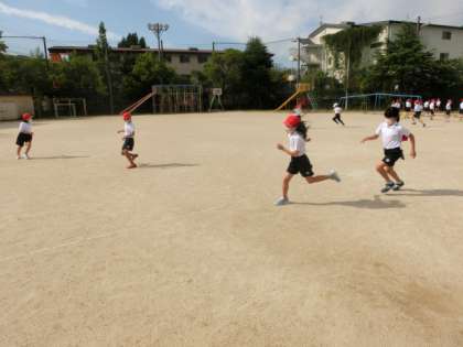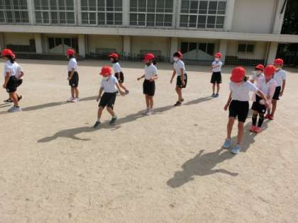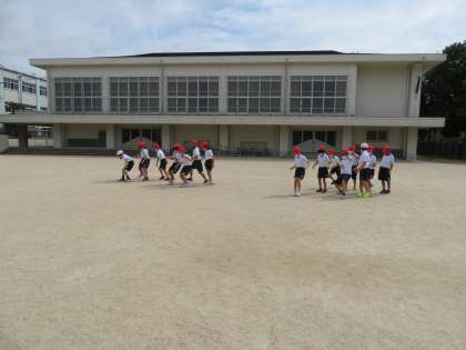 理科の学習で「地面のようすと太陽」の単元に入りました。今日は,影ふみ遊びから,影のでき方と太陽の位置を確認しました。遊びの中から,影は太陽の反対側にできることが分かってきました。全員同じ向きに影ができることから,「影つなぎ列車」で競争しました。太陽が東にあるので,西に向かって楽しく行いました。