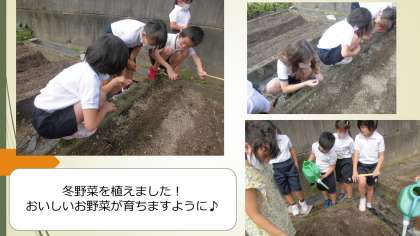 また,畑の先生から預かった冬野菜の種を畑に蒔きました。先週は,ブロッコリーとキャベツを,今日はほうれん草,かぶ,大根を蒔きました。先週植えた,キャベツやブロッコリーはもう芽がでてきました。おいしい野菜が育ちますように!