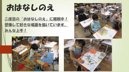 また,図工では二度目のおはなしのえに挑戦中!1組は『ジャックのどきどきモンスター』,2組は『ジェンとほしになったテリー』というおはなしで絵をかいています。前回おはなしのえを描いたとき,描く場面を全体で決めて描きましたが,今回は自分の好きな場面を描くことに挑戦中!想像しながらおはなしを聞いて,自分の頭の中に思い浮かんだ情景を上手に表現しています。明日も図工があります。完成にめがけて頑張りましょう!