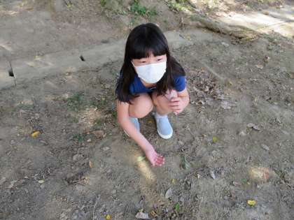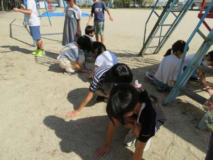 実際に外に出て日かげと日なたの土を触りました。「日かげは涼しいな,土もつめたい。」,「日なたは暑い…。土もさらさら。」,「日かげは暗いけど,日なたは明るいね。」とたくさんのことに気付いていました。朝と昼過ぎの2回観察してみると,気温が大きく違い,みんな「日なた暑いね!」と驚いていました。