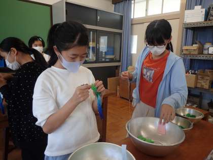 心を込めてみんなで折った鶴を代表の子たちが心を込めて束にしてくれています。