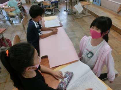 陵ヶ岡の宝物「どうして陵ヶ岡小学校ができたのか」を,調べてきました。地域の方々に聞いたり,おじいちゃんおばあちゃんに聞いたり,昔の写真を見たりして考えたことや思ったことをみんなで交流してきました。調べて分かったことを壁新聞にまとめることにしました。記事ごとにグループに分かれて原稿を書いて,新聞に書き始めました。みんな協力して取り組んでいます。