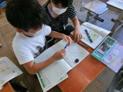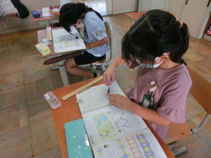 コンパスを使って模様作りをしました。教科書の模様はとてもきれいで,みんなは「早く描きたい。」という気持ちで取り組みました。しかし,いざ描き始めると,模様の円の中心がどこか分からない子や,半径が何センチなのか分からない子が・・・でも,教科書に直接コンパスをのせて円を描いて確かめる子や方眼のマス目を数える子が出て来て,だんだん描けるようになってきました。できた子は,分からない子にアドバイスする姿が見られました。みんながきれいな模様を描けるようになるといいな。頑張って。
