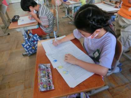 「すがたをかえる大豆」のような,姿をかえて食品になる材料について,説明する文章を書いています。「初め」の部分の問いかけが工夫されている文章を書いている子がいたのでみんなに紹介しました。また,最後の「終わり」のまとめの部分も読者に投げかける文章が書けている子がいたので紹介しました。紹介した友達の文章に刺激を受けて,自分の文章に手を加える子も出てきました。どんな説明する文章を書いたのか,みんなで交流するのが楽しみです。