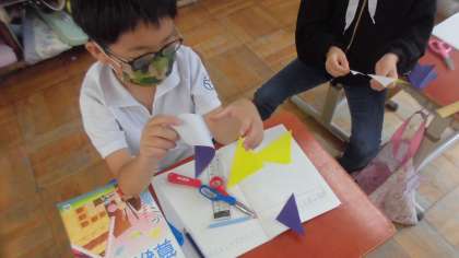 四角形のものはたくさんあったのですが,三角形の形をしたものは少なかったようです。お家でも三角形や四角形の形をしたものを見つけてみてください。