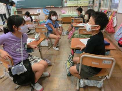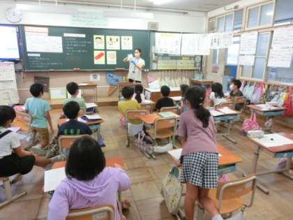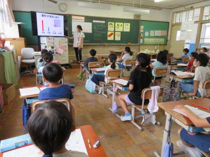 食に関する学習で,大豆について学習しました。ちょうど国語の学習で「すがたをかえる大豆」を学んだところなので,とても興味をもって取り組みました。国語の振り返りあり,クイズあり,ペアやグループで相談する時間ありで,どんどん大豆の魅力を学んでいきました。最後には目の前で茹でた大豆をジューサーにかけて絞り,豆乳とおからを作って見せてもらいました。子ども達の中から,「豆乳飲んでみたい。」という声が上がりました。体にとてもいい大豆を,おいしく食べていきたいです。さあ,今日の給食の大豆は,どんな姿になっているのかな。