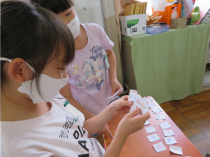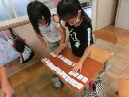 まずはみんなでアルファベット並べゲームをしました。時間内に隣の人と協力してAから順に並べたり,ZからAに向かって並べたりしました。「あー!間違えた。」,「A,B,C...次はDやん。」とみんなつぶやきながら活動していました。そのあとはカードを使って友だちと“Here you are.”“Thank you.”“You are welcome."とやりとりをしながら,自分のイニシャル集めをしました。外国語でやりとりをすることにも慣れた子が増えて,元気な声で活動できました。
