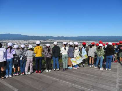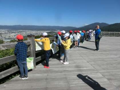 まず,将軍塚の青蓮院門跡の舞台から京都市の中心部を見ました。左大文字が正面に,真ん中に京都御所の森が,右下に平安神宮の大鳥居の朱色がきれいに見えました。その奥に平安神宮もしっかり見えました。その後,展望台に移動して南の方も見ました。すると,京都タワーや東寺の五重塔,さらにアベノハルカスまで見えました。