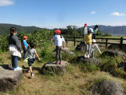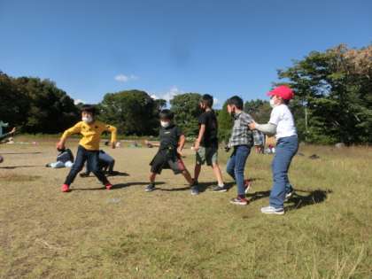 おひるの後は遊び時間です。広場になっているところでダンスをしたり,石でくつろいだり,花いちもんめをして過ごしました。中には疲れて横になって少しお昼寝している子もいました。ボールや遊具はないけれど,自分たちだけで遊ぶのも楽しいですね!