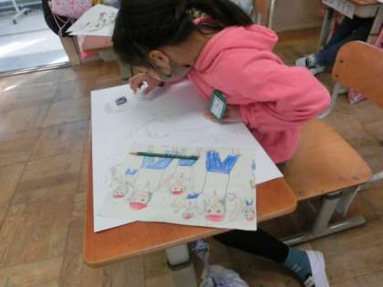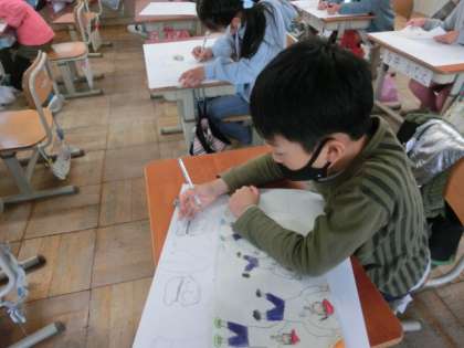 スポーツデイで一番心に残ったことを描いています。80m走で精一杯走っているところ,リズムダンスで楽しくダンスしているところなど,心に残った一瞬を切り取って描いています。下絵ができた子から四つ切の画用紙に大きく写して,絵具で色を付け始めました。また,スポーツデイのみんなの姿がよみがえってきました。