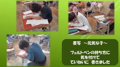 今日は書写でフェルトペンを使って,「元気な子」と書きました。
