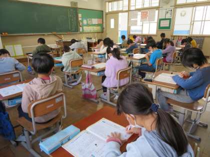 作文用紙に教科書を見ながら書きました。句読点,かぎ,小さい文字を書く位置を意識し,ひらがなやかたかなは漢字よりも小さめに書きます。みんな正しい姿勢やえんぴつの持ち方でゆっくり丁寧に頑張りました。