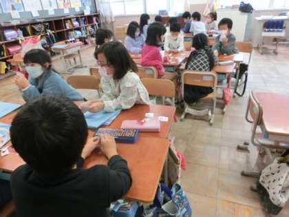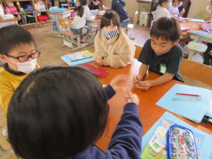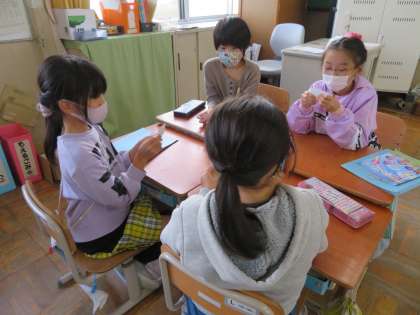 今日は,色や形,欲しいものを尋ねたり答えたりすることになれるよう「マッチングゲーム」をしました。「What do you want?」 と尋ねてくれたら ほしいカードを相手に「〜,Please.」と言ってトランプのババ抜きのように進めました。カードがそろうと捨てていってカードがなくなったら上がりです。繰り返す中で,英語で話すことができるようになってきました。