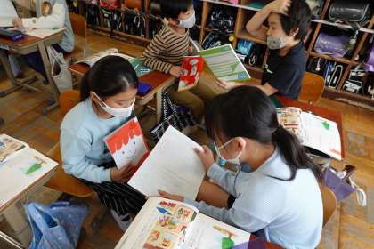 国語科「漢字の広場」の学習で,休日の様子を絵の中の言葉を使って書きました。どこで,どんな人が,何をしているのかがわかるように気を付けて書いた後,友達とどんな文を考えたのか紹介し合いました。