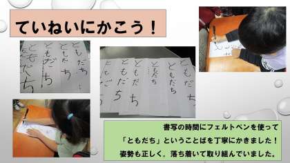 また書写の時間ではフェルトペンを使って,「ともだち」ということばをかきました。最近漢字の学習をしているので,ひさびさにひらがなのとめ・はね・はらいなどを確認していくと,ひらがな難しいなぁという意見が出てきました。