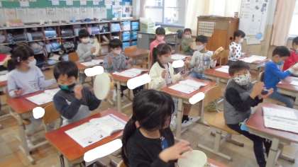鍵盤ハーモニカだけではなく,カスタネットやタンブリン使ってリズムを重ねることも楽しんでいきます。