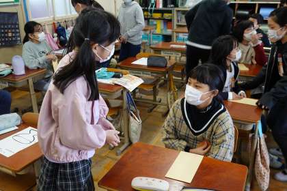 外国語活動では,Unit7「What do you want?」の学習に取り組んでいます。今日は,お店屋さんごっこをしながらほしい果物を集め,フルーツパフェを作りました。お店ばんをする人は,お店に来たお客さんに「What do you want?」と聞き,お店にお客さんがほしい果物があれば渡すことができます。お客さんは,お店屋に何が売ってあるのかわからないので,たくさんのお店をまわって自分のほしい果物を集めていました。