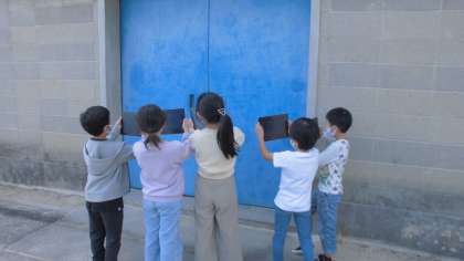 また,「ともだちみつけた!」では,タブレットを使って写真撮影をしました。教室の椅子やネジ,運動場の扉や窓,木の枝や花などをよく観察すると顔に見えてきます。顔に見える形のおもしろさを味わい,見つけることを楽しみました。