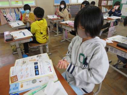 はじめに手洗いについて学びました。コロナ禍になってみんなしっかり手を洗っていますが,手を洗わないとどのくらい菌が手についているのか写真を見て「うわあ。きたない!」と驚いていました。