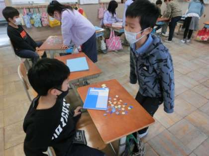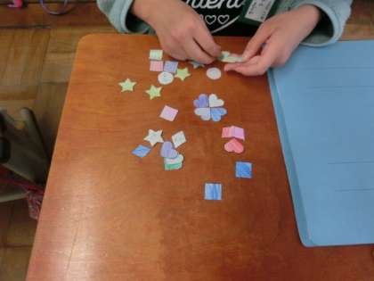 一人ひとり作った色形カードを「What do you want?」と言って,来た友達に声をかけ,声をかけられた友達は,「A pink circle please.」などと言ってカードを集める遊びをしました。何人もの友達の所に行ってカードを集めて,最後にオリジナルの形を作って見せ合いました。楽しく取り組んでくれています。