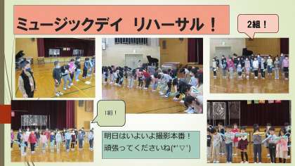 今日は二回通しを行いました。一回目の通しが終わったあと,体育館での響く声について話し合いました。響く声を出すためには,歌うことが楽しい!と思うような笑顔で歌う必要があります。子どもたちに笑顔で歌ってね!と伝えて,二回目を歌うととても良い歌声が聞こえてきました♪明日の撮影本番では,今までの練習の成果が出せるように頑張りましょう!