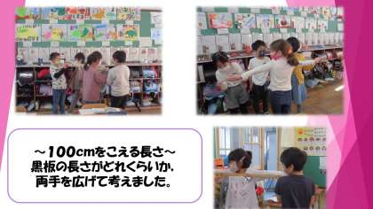 最初に,黒板の長さはどれくらいあるか考えました。30cmものさしを使ってはかったり,手のひらを広げて何個分かを考えたりして,予想しました。思っていたよりも黒板の長さは長くて,「そんなに大きいのか!!」と,とても驚いている様子でした。