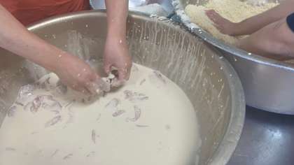 ヒレカツは,給食室で一枚ずつ衣をつけて作りました。ヒレカツにかけるソースも手作りです。
