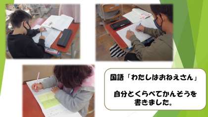 今日は国語「わたしはおねえさん」の感想を自分と比べて書きました。登場人物のすみれちゃんの気持ちと,自分の気持ちを比べて,ちがうところや同じところを見つけて感想を書くことができました。