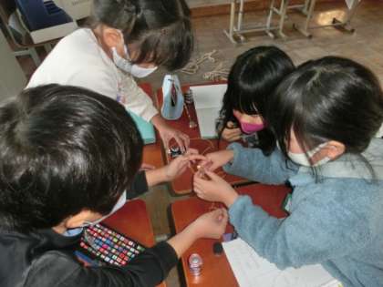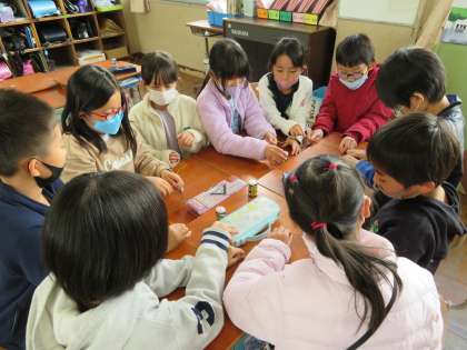 導線をつないで,遠くにある豆電球に明かりをつけました。まずは,二人から。回路になるように乾電池と豆電球をつないでいきました。次は,グループで。さらに,6〜7人で。最後には,クラスの半分の10人で導線をつないで豆電球に明かりをつけました。