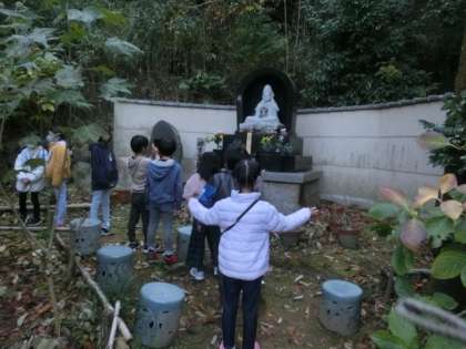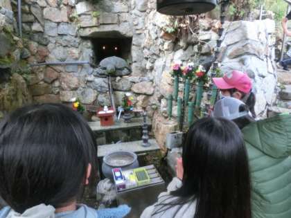 実際に亀の水を見て「こんなところにあるんか。」,「亀の口から水が出ているね。」とお話していました。そのあと亀の水の近くの大乗寺にも立ち寄りました。たくさん小倉百人一首の石碑がおいてあり,「なにかな。気になる。」と言っていました。