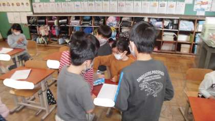 運動場では,おにごっこやドッジボール,大繩で遊び,教室では,生き物ビンゴをしたり,オルガンを弾いたり,みんなでみっけを見たりしています。