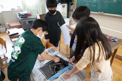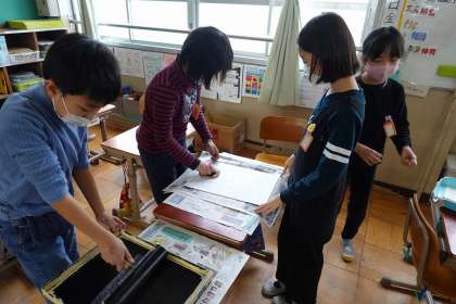 図画工作科で版画をすりました。グループで協力しながら学習に取り組むことができ,「すごい!」「いい感じ!」などの声がたくさん聞こえていました。