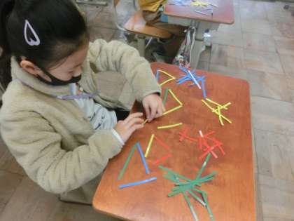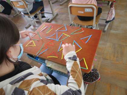 今日は教科書の巻末についている色棒を使ってさまざまな三角形をつくりました。作った三角形から気づいたことを出し合い,教科書に載っている三角形をなかま分けしました。「同じ長さの棒3つでできているね。」,「これは長さが3つとも違う三角形や。」とみんなたくさんのことに気づきました。