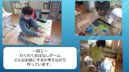 図工は「わくわくおはなしゲーム」の学習をしています。動物がでてくるお話や,大人になるまでのお話など,それぞれ考えておはなしゲームを作っています。