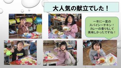 体育で疲れた体にしみる給食の献立は・・・はじめてスパイシーチキンがでました!少しカレーの香りがするチキンに子どもたちは大喜び。ミネストローネとの相性ともぴったりでしたね。増やす子も多く,嬉しかったです!