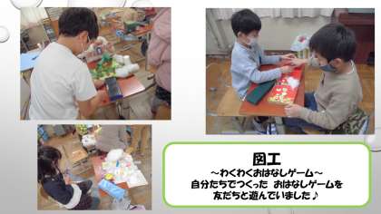 完成した人からルーレットやさいころを作りました。作ったおはなしゲームで遊んでいると,「○○さんのすごろく,めっちゃおもしろい!」など話している姿があり,自分たちのオリジナルおはなしゲームで楽しむことができました。