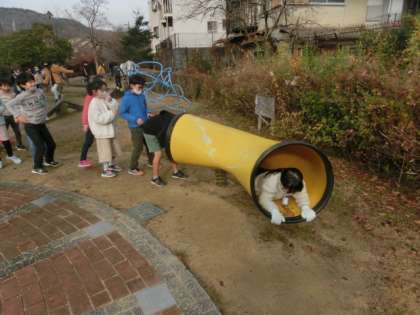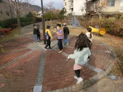 みどりの径は京阪電車の京津線が通っていたところだよ。と言いながら歩きました。ここには,遊具があって,日時計もあることが分かりました。